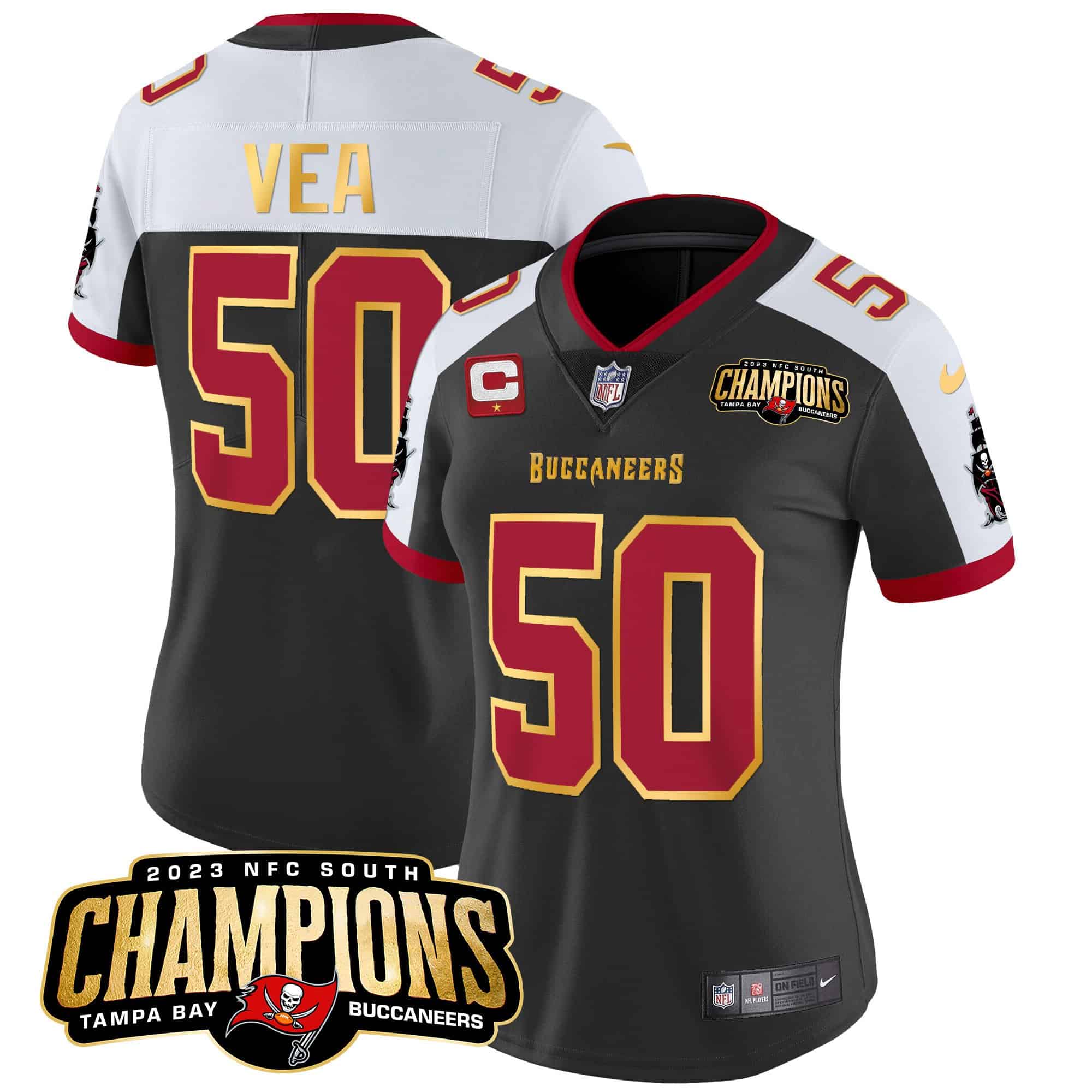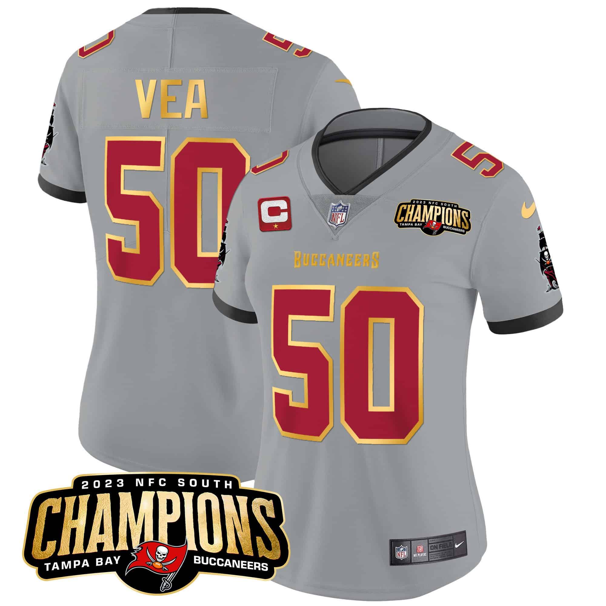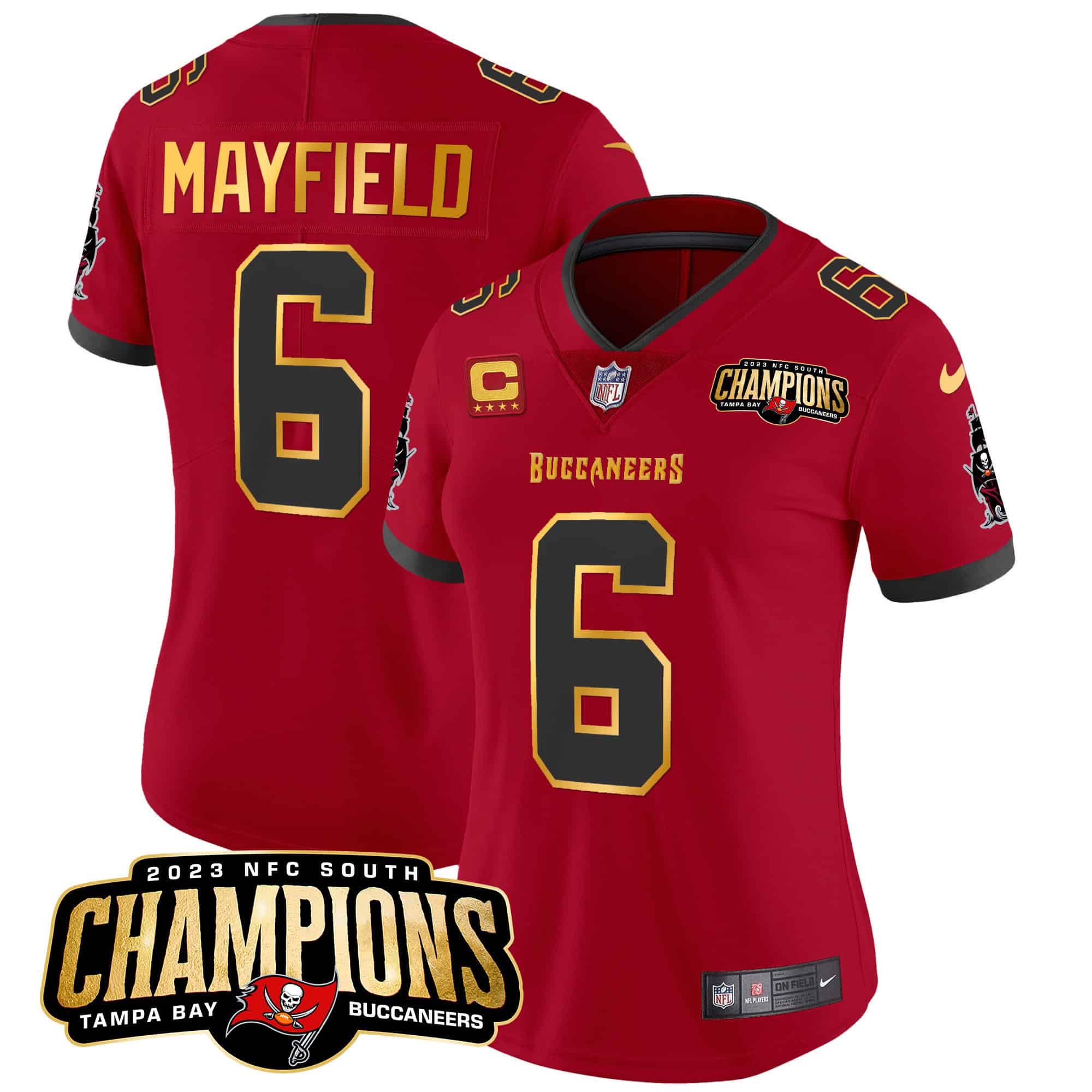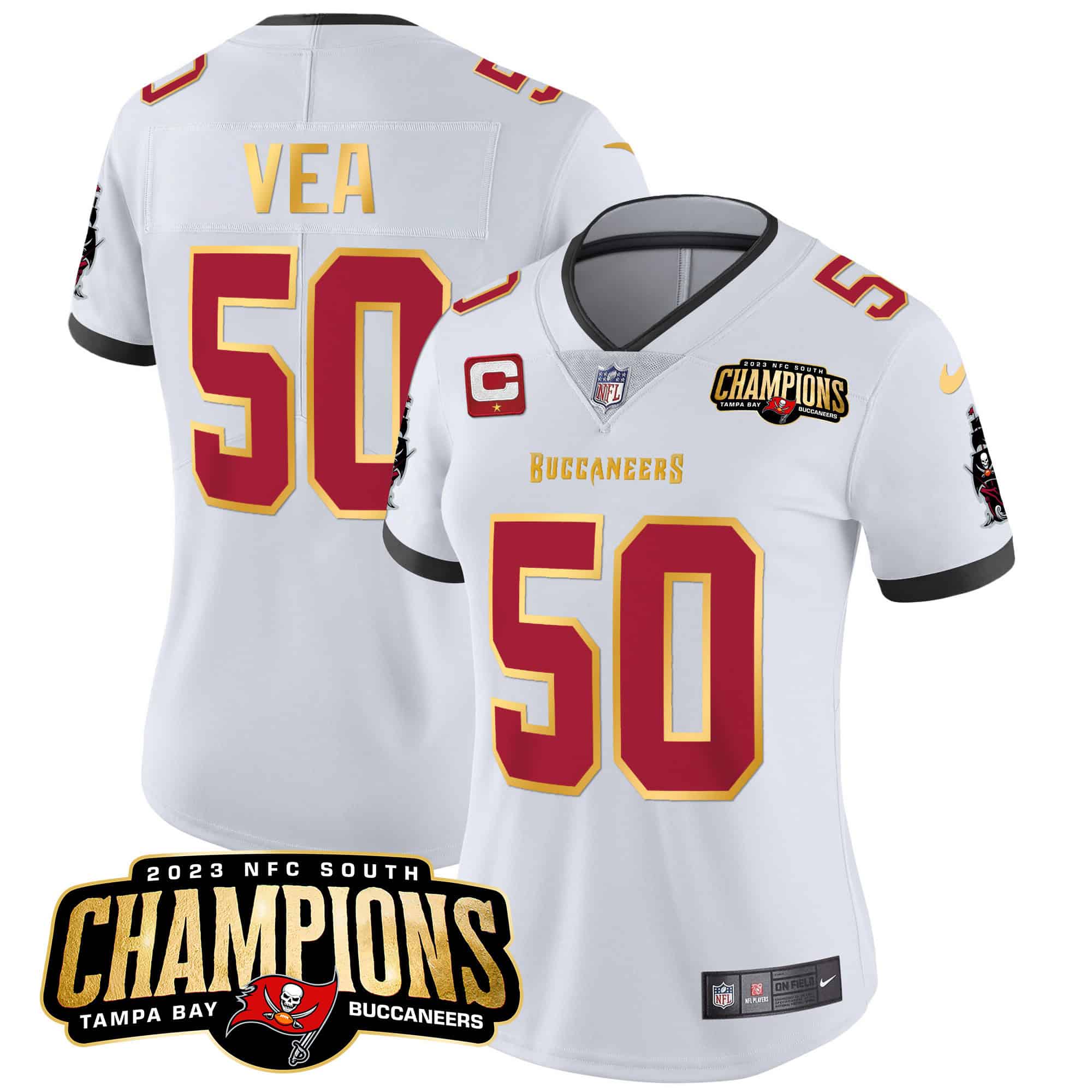 Women’s Buccaneers 2023 NFC South Champions Patch Gold Trim Vapor Jersey – All Stitched