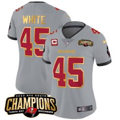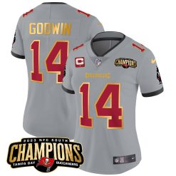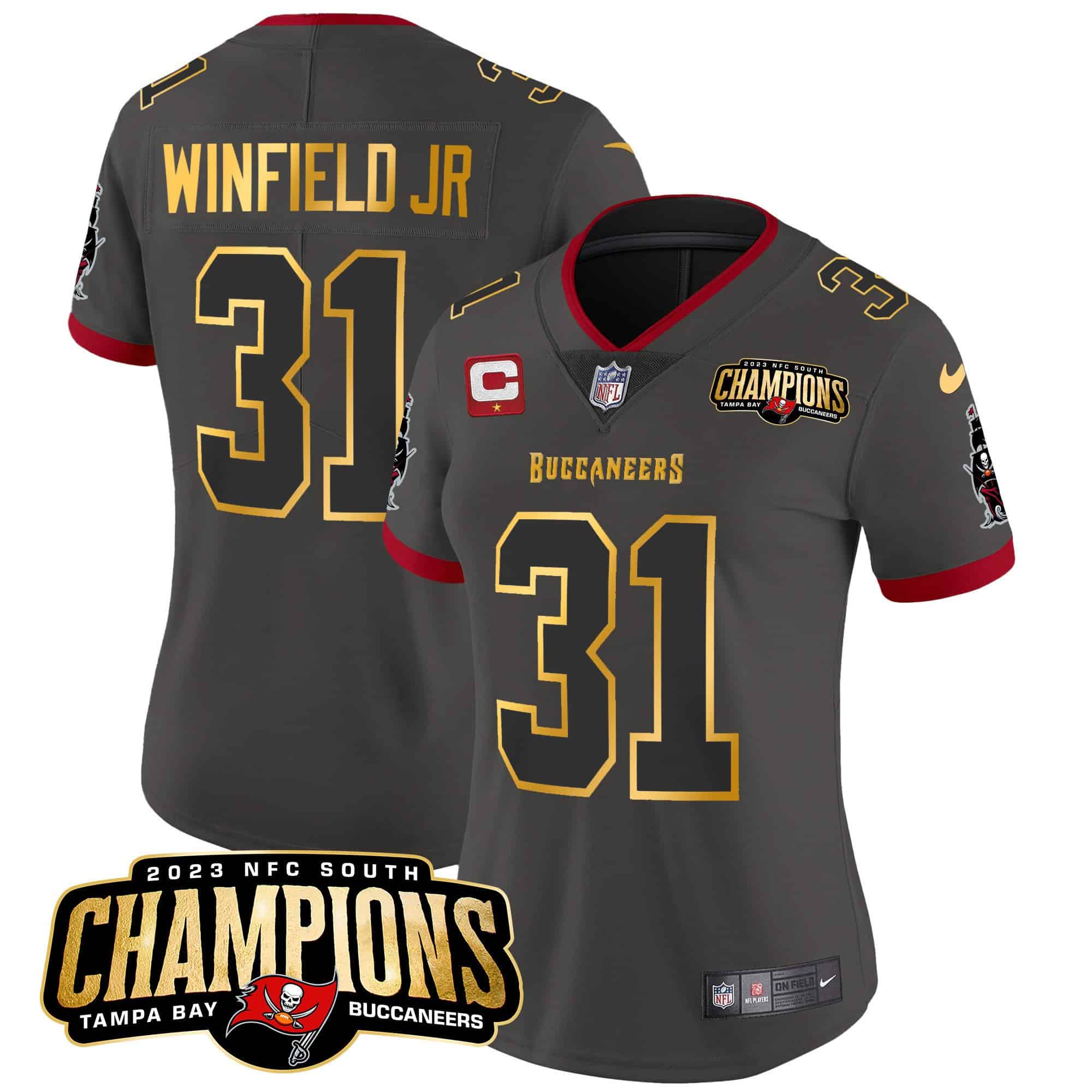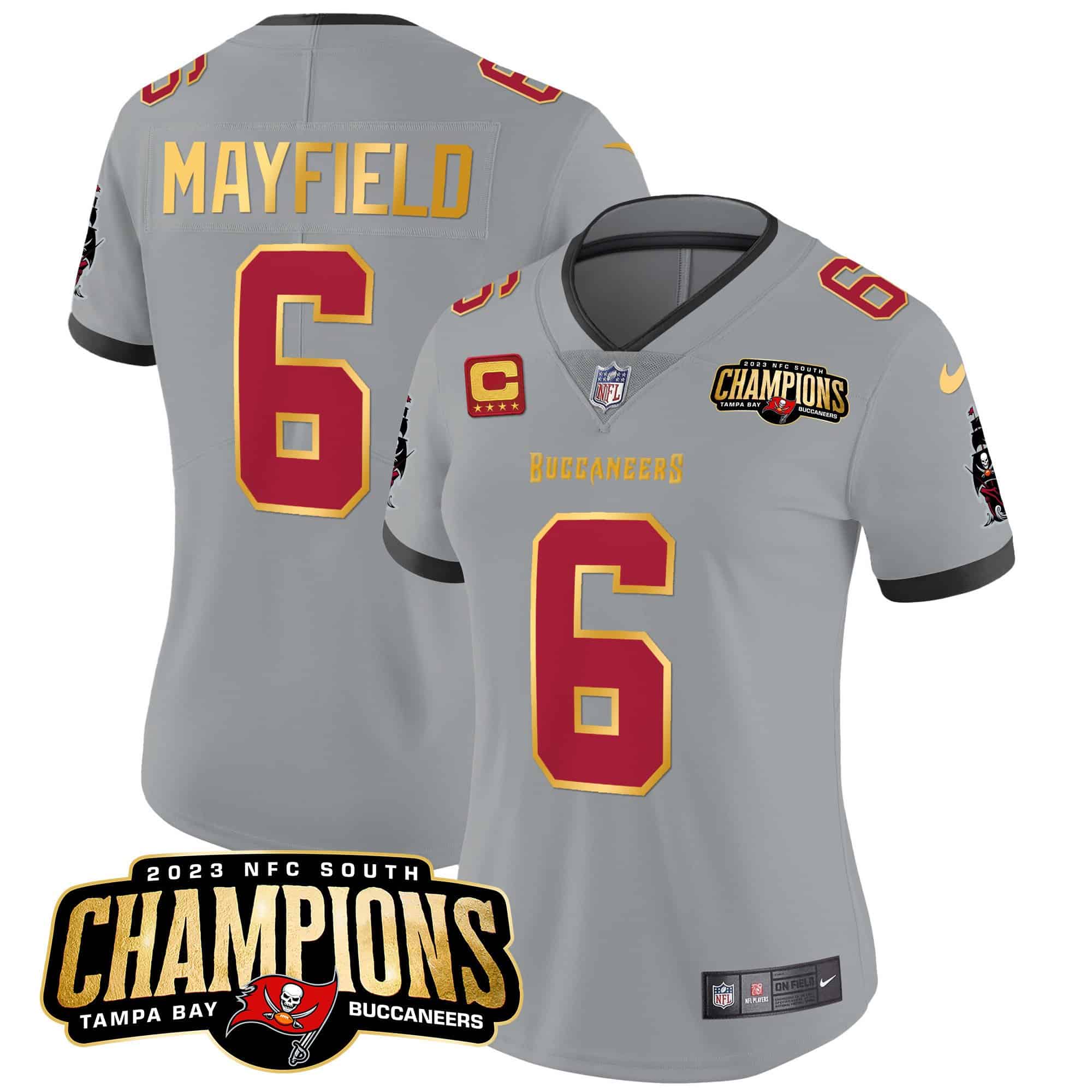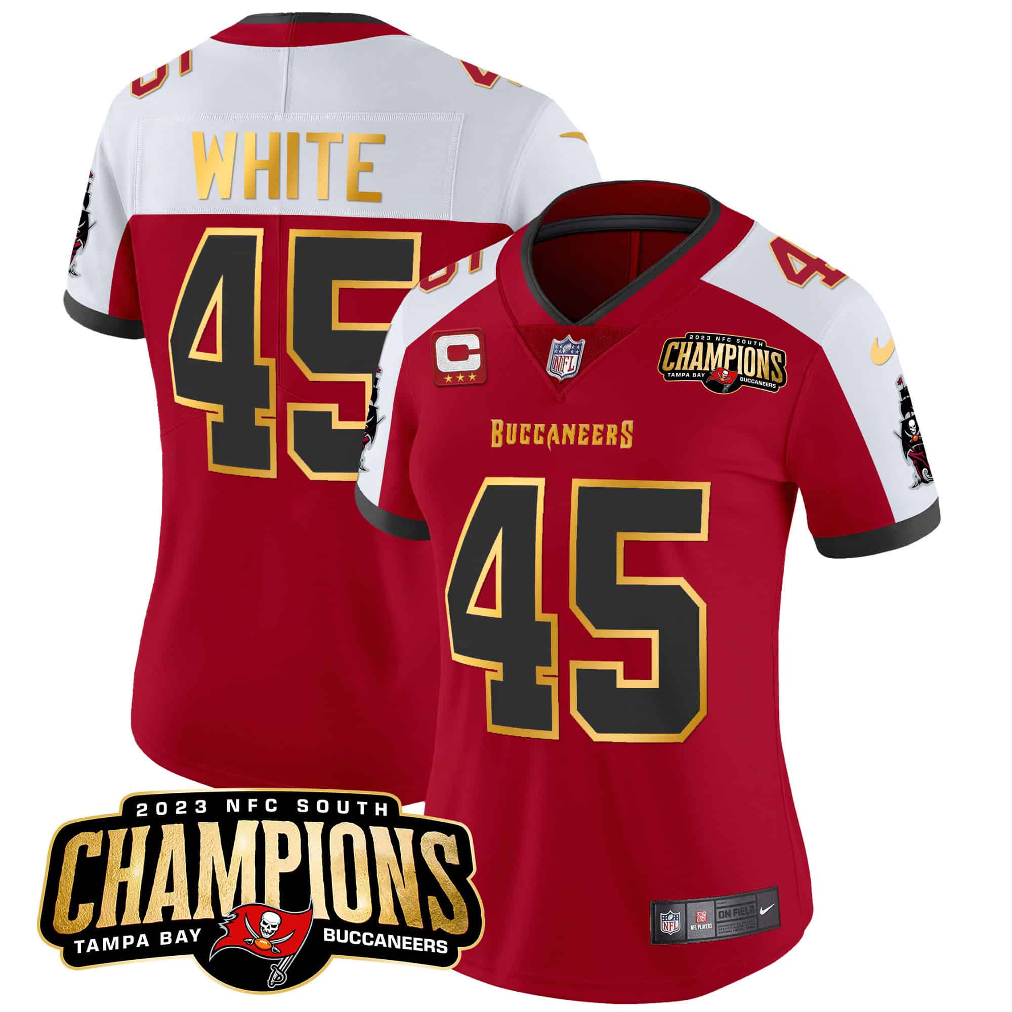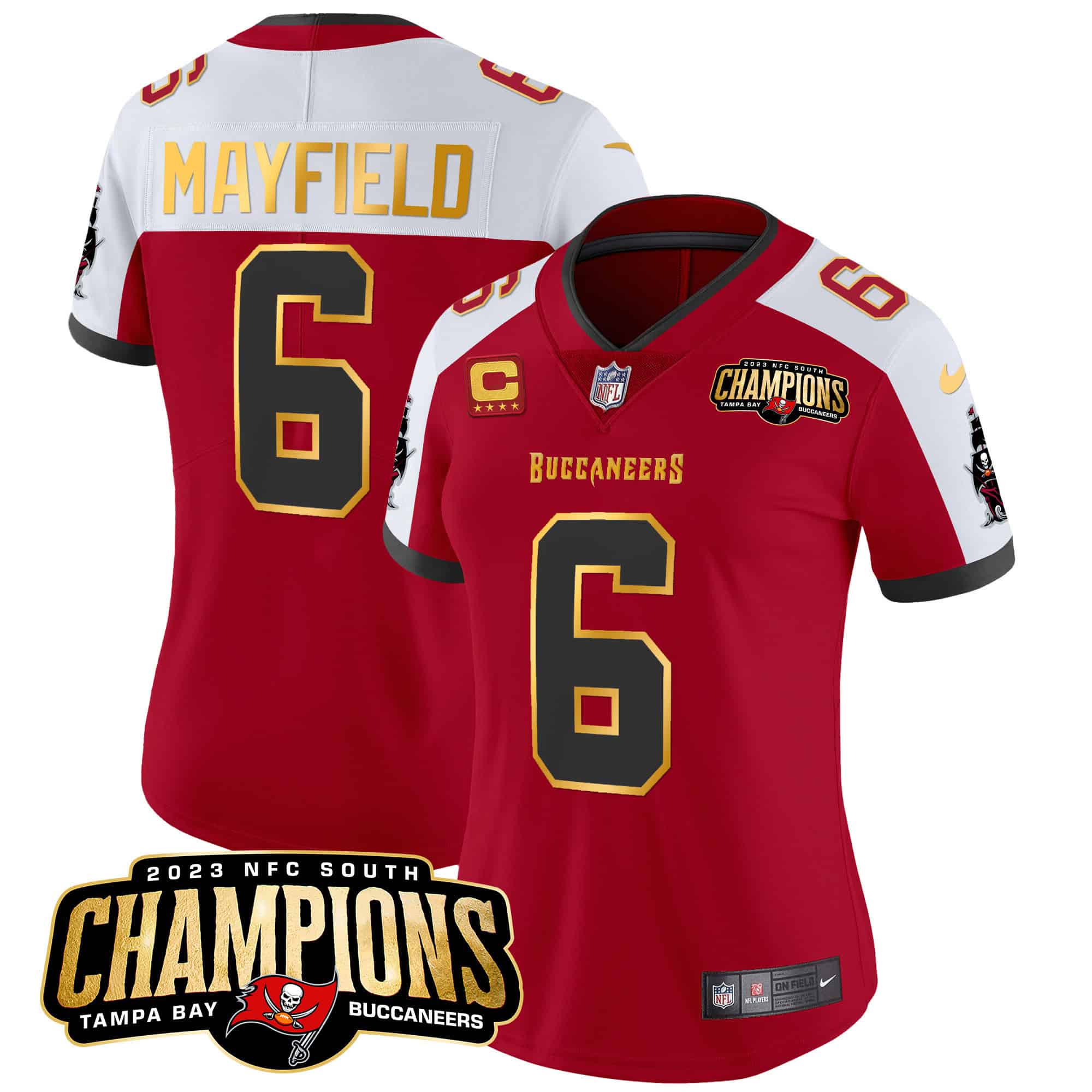 Women’s Buccaneers 2023 NFC South Champions Patch Gold Trim Vapor Jersey – All Stitched